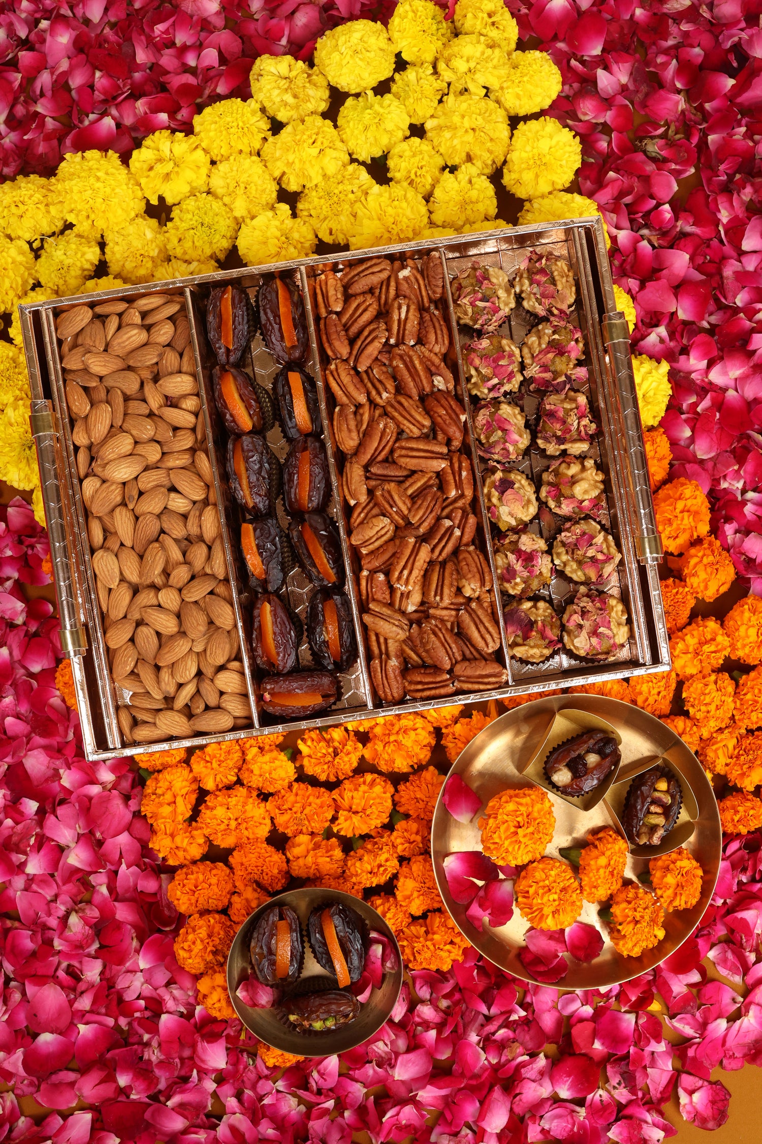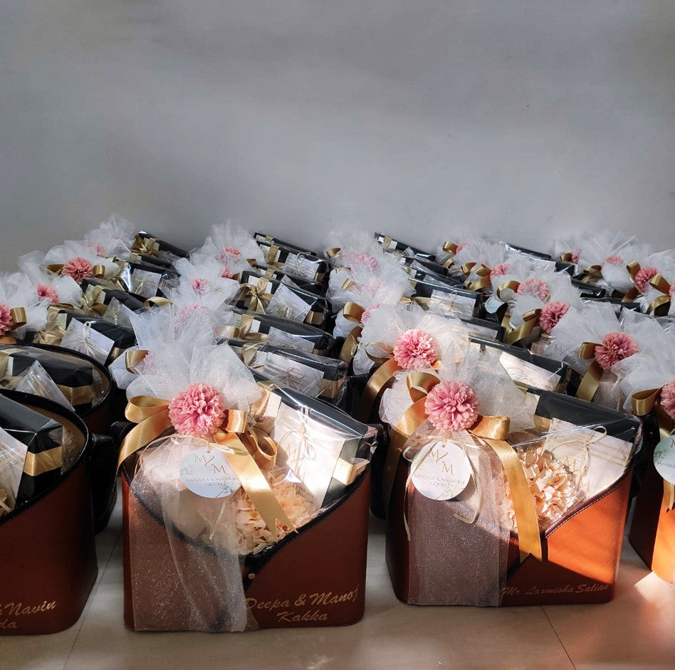 These 100 + Beautiful Faux Leather Baskets, sent as 50th wedding anniversary return favours, were curated with our selection of premium Dry fruits and exotic Stuffed Medjool Dates. Each hamper with an exclusively designed personalised message card from the couple and a tag was hand delivered!