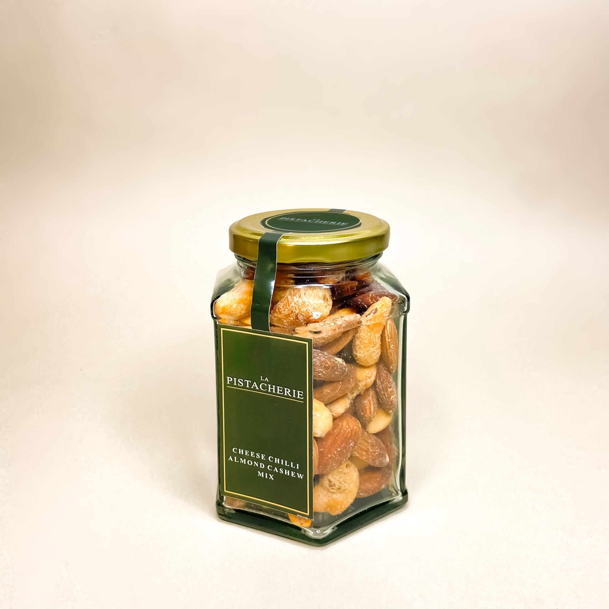 Jar contains Californian Almonds and Indian Cashews, coated with powdered cheddar cheese and chilli powder.